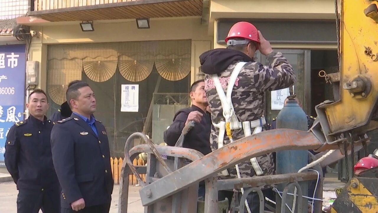 13日上午,记者在城区仙鹤路与江陵大道交汇处看到,县城市管理执法局的执法人员正利用吊装车对一处高空违规广告进行依法拆除,现场井然有序。
