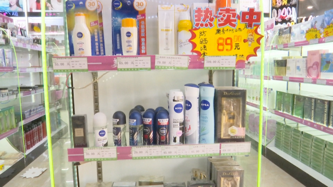 位于城区的一家超市,美妆专柜的部分防晒产品已经售空。七月到九月是防晒产品的销售旺季,出于全身防晒的需求,大多数人会选择防晒霜搭配防晒喷雾使用,通常防晒倍数越高的产品销量越好。