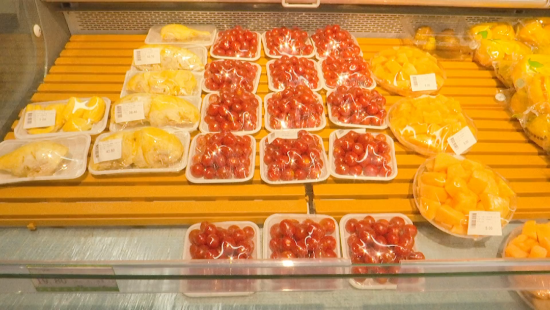 因为天气热了,顾客都爱吃冰的东西,我们把热带水果都放在这个冰箱这里,顾客方便拿。