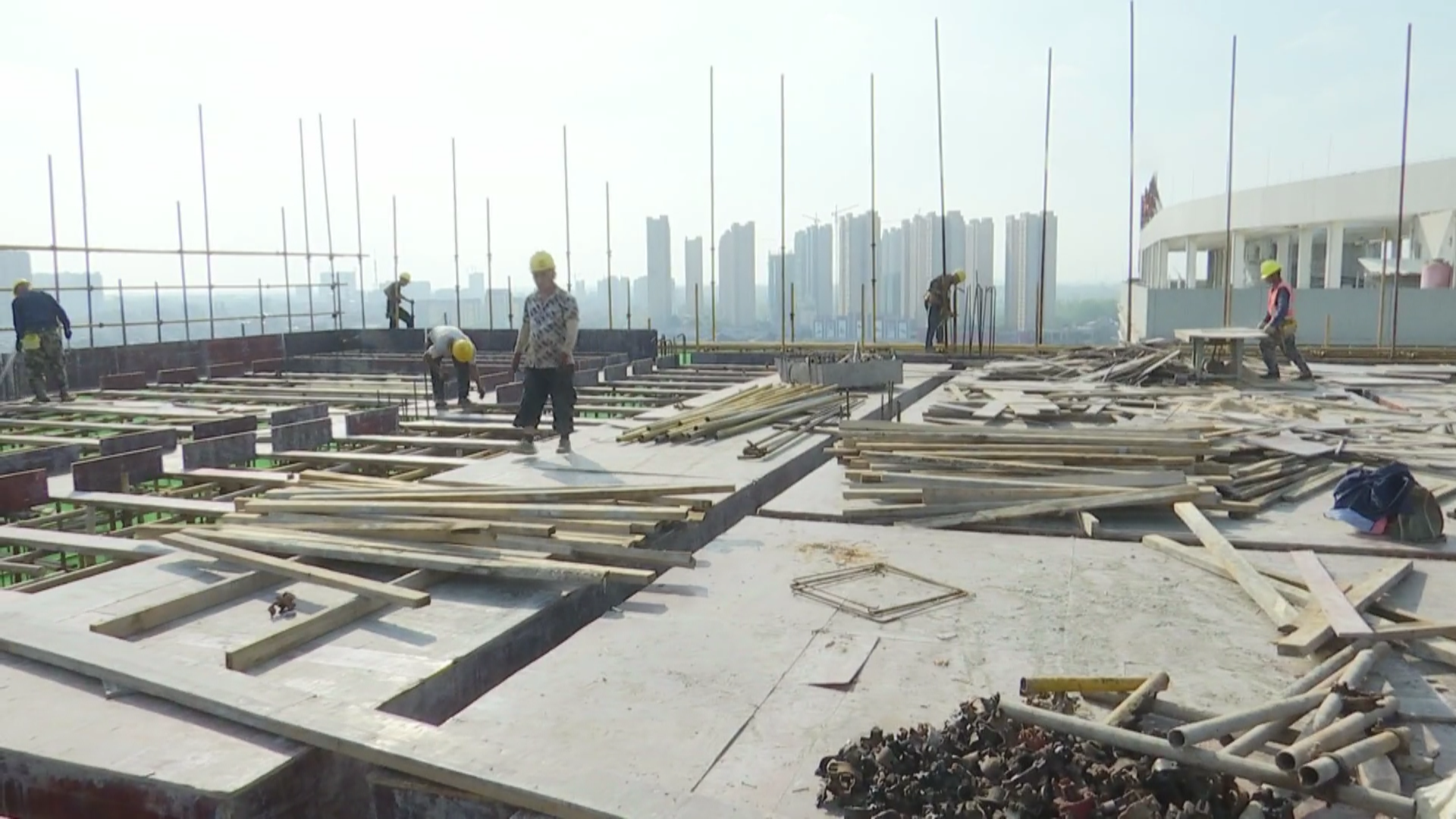 建设项目施工现场内科楼主体工程已经封顶施工人员正在进行楼顶装饰工程及室内墙体砌筑