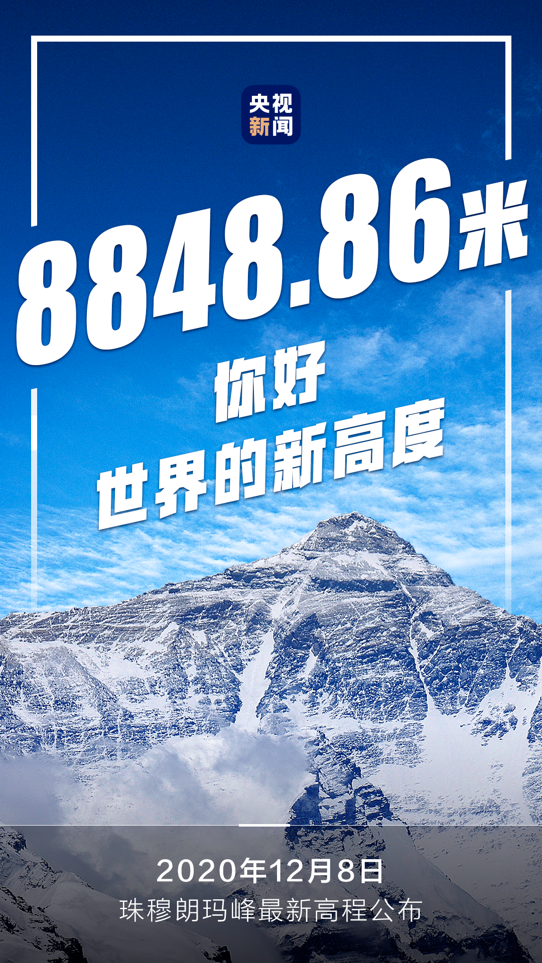 12月8日,国家主席习近平同尼泊尔总统班达里互致信函,共同宣布珠穆朗玛峰最新高程——8848.86米。