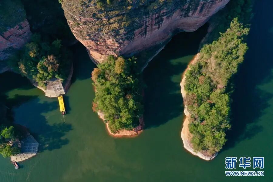 游船行驶在福建省三明市泰宁县大金湖湖面上,带领游客欣赏水上丹霞景观(11月20日摄,无人机照片)。新华社记者 姜克红 摄