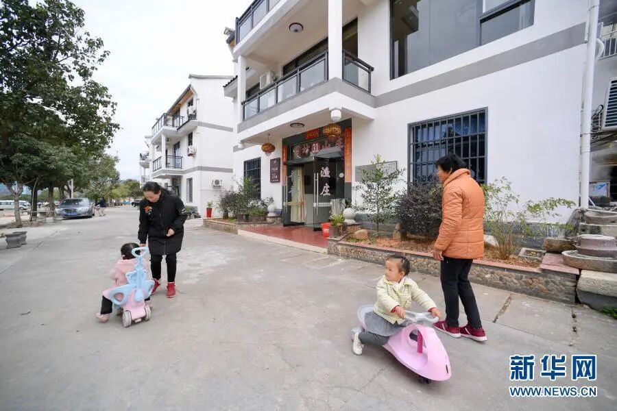 福建省三明市泰宁县大金湖畔的梅口乡水际村村民在新居前休闲(12月9日摄)。新华社记者 姜克红 摄