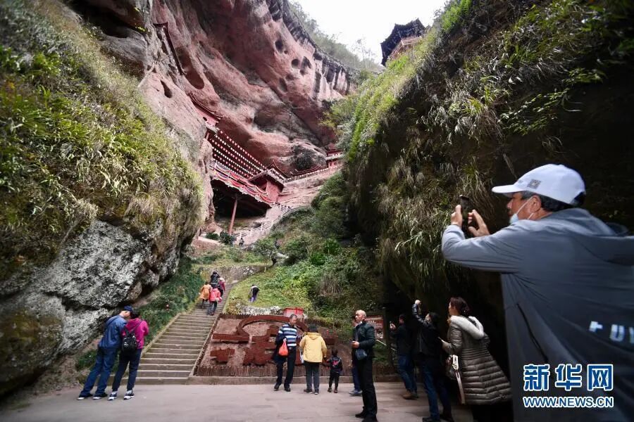 游客在福建省三明市泰宁县大金湖景区参观丹霞古寺——甘露寺(12月9日摄)。新华社记者 姜克红 摄