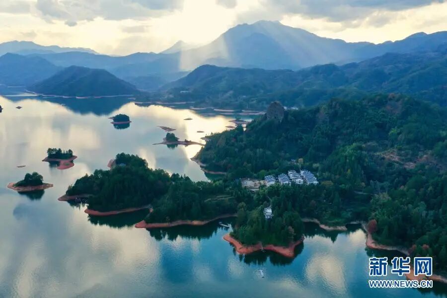 这是夕阳下的福建省三明市将乐县高唐镇常口村及附近山水(11月20日摄,无人机照片)。新华社记者 宋为伟 摄