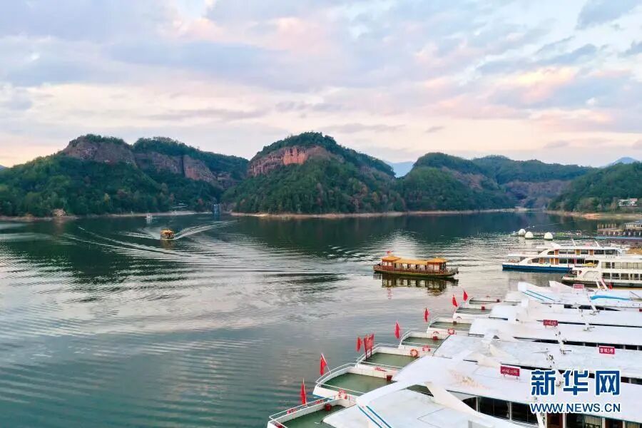 一艘游船停靠在福建省三明市泰宁县大金湖旅游码头(11月20日摄,无人机照片)。新华社记者 姜克红 摄