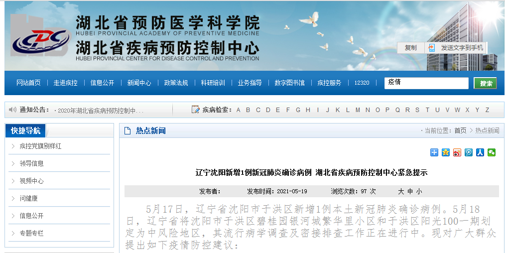 一、2021年5月1日(含)后来自辽宁省沈阳市于洪区的来鄂返鄂人员,请主动到当地社区进行申报并配合当地疫情防控指挥部的所有防控措施。