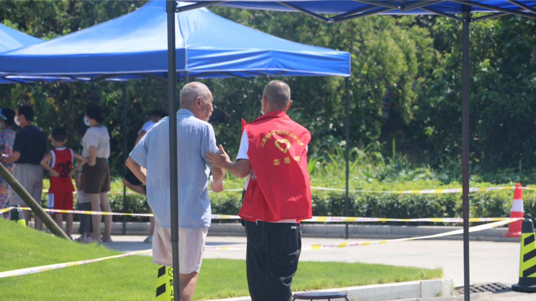 此次演练中,三湖管理区租用凳子500把,还设立了饮水区,志愿者对行动不便人员提供了相应的帮助,并对近50名卧床在家人员进行上门采样,做到了倾情服务,关怀到位。