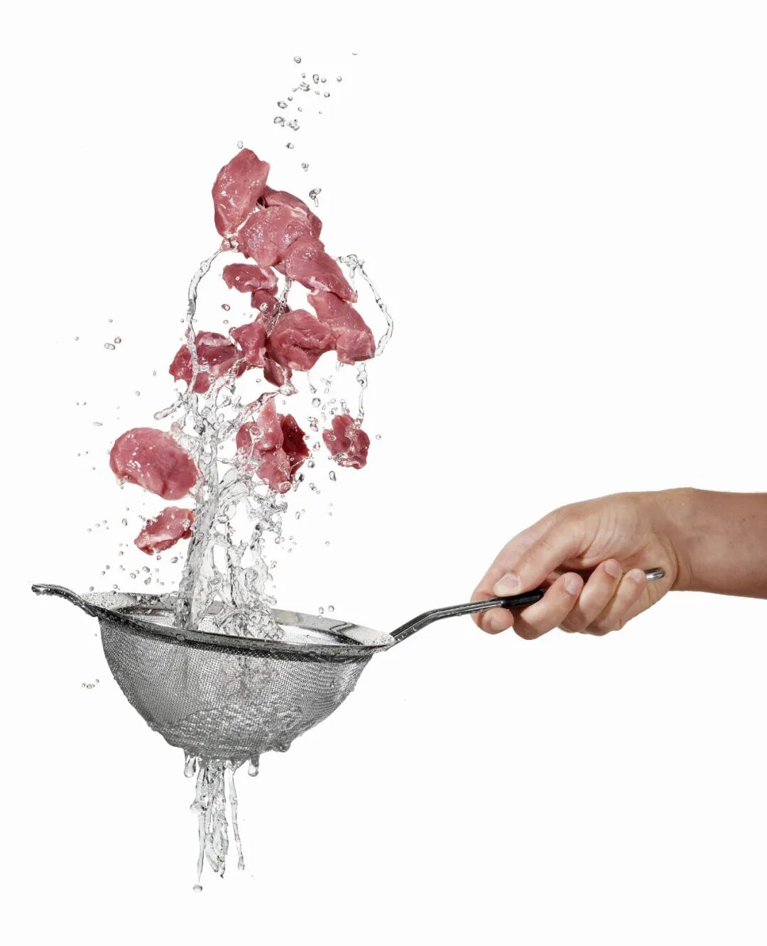 买回家的冷冻食品要认真清洗清洗时注意防止水花飞溅不要在水龙头下直接冲洗防止溅洒污染可放到盆中清洗减少交叉污染风险