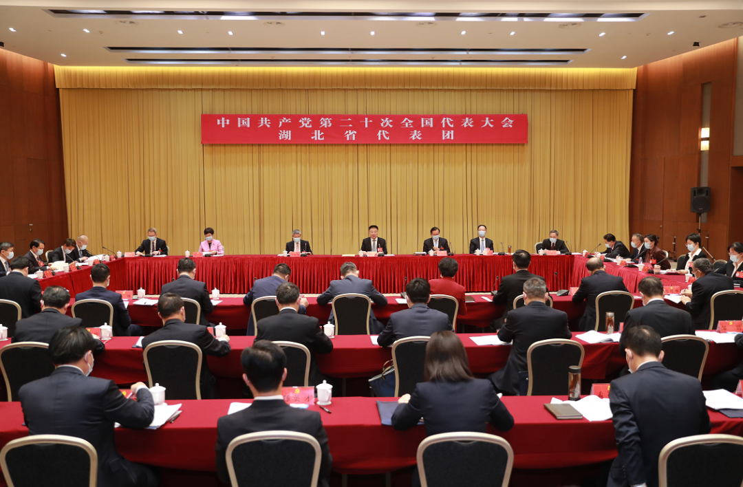 10月16日下午,出席党的二十大的湖北代表团召开全体会议,传达学习习近平总书记在党的十九届七中全会上关于党的二十大报告起草工作的说明,认真研读、学习讨论党的二十大报告。