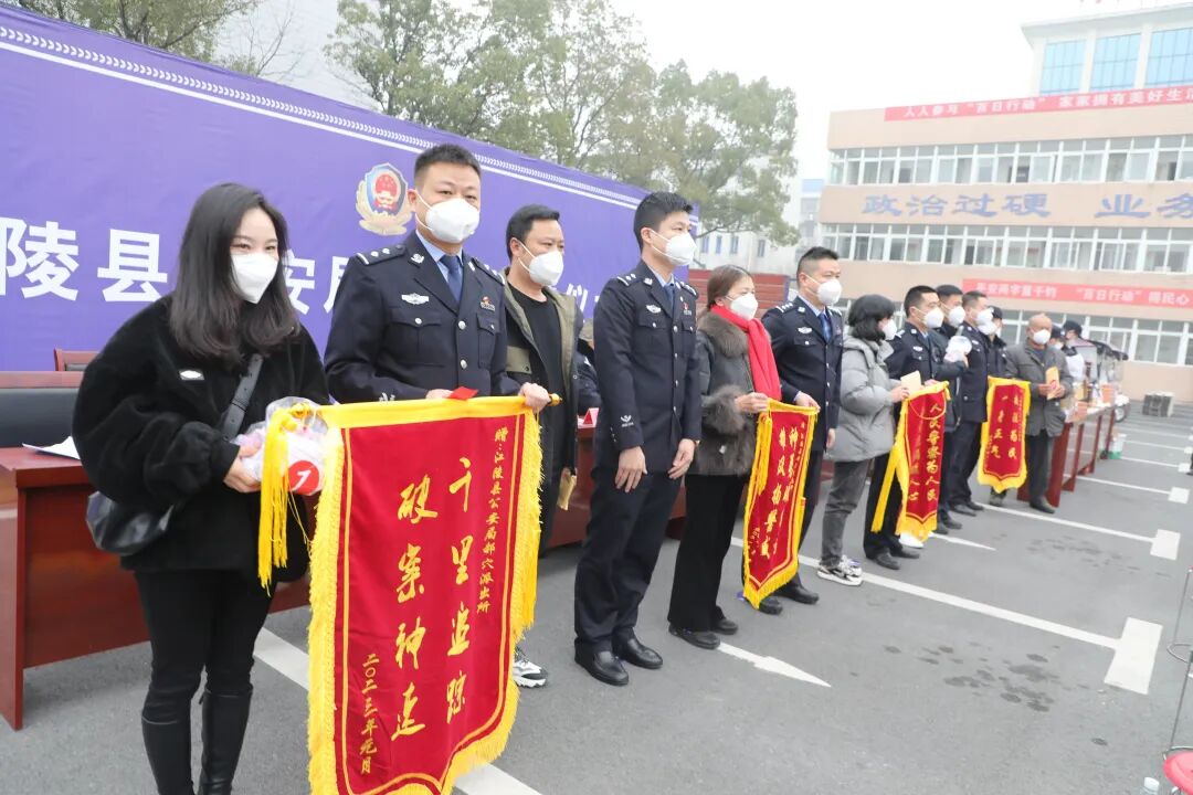 活动现场,32名受害群众依次上台,签名确认,领取民警为他们追回的现金、烟酒、电动车、手机等财物。随后,群众将一面面锦旗送到民警手中,现场响起阵阵掌声。