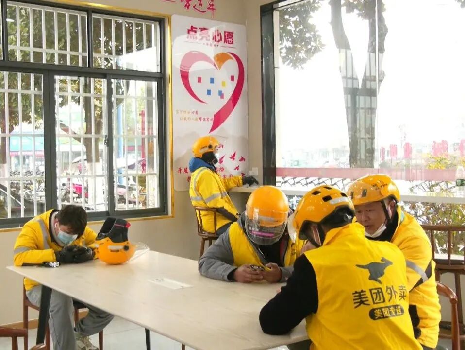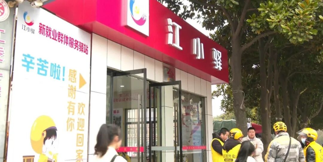 为增强新就业群体的获得感、幸福感、归属感,江小驿由县委组织部牵头,郝穴镇、县市场监督管理局、美团江陵站、饿了么江陵站共同设计、共同出资、共同建设、共同管理,在2022年底建成并投入使用。建成之初,江小驿便将“党建引领”贯穿始终,组建了新就业群体党建服务联盟,为新就业群体提供党建指导、就业创业、劳动维权、法律援助、困难帮扶等专业服务。