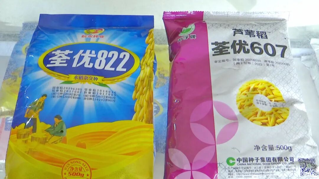 农资店店主别必圣:我们以政府的优质粮食工程为指导,以(荃优)607、822为主,现在每天在下村,整体推进,农户对质量和效果都满意。