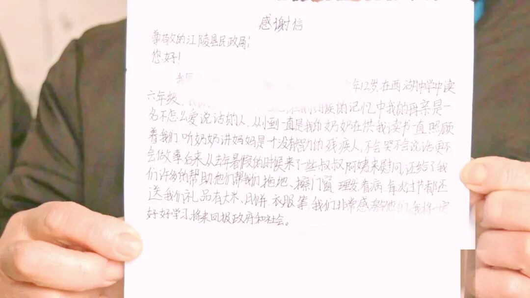 △胡静受助人家属雷正香告诉我们,服务人员十分关心老人,每隔3-5天就会来探望一次。她的孙女还为服务人员写了一封感谢信。