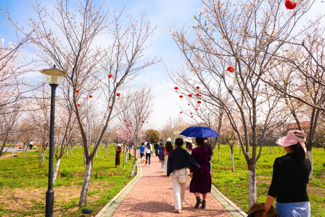 蔚蓝的天空下,粉色的樱花娇俏可爱,层层叠叠的花朵绚丽多姿。前来赏花的游客络绎不绝,他们漫步在樱花步道上拍照打卡、或是湖上泛舟。闻着小园花香,尽览湖边春色,与家人朋友一起尽情享受春日惬意的闲暇时光。