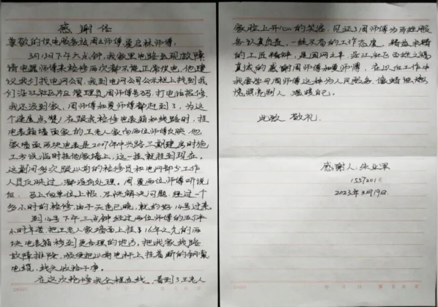 近日,家住郝穴镇沿江社区居民朱先生家中电路故障导致停电,他立即打通网格服务电话报修,国网江陵县供电公司的电力网格员立即赶到现场进行排查。经过一个多小时的抢修,恢复了供电。事后,朱先生为表达感激之情,特地给供电公司送来一封感谢信。