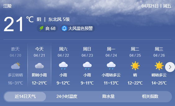 最低气温:鄂西北12~16℃;其他地区17~21℃