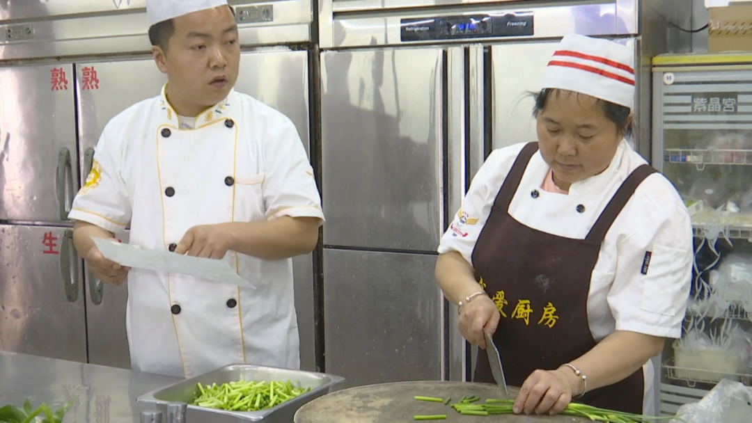 早上9时,江陵县锦天大酒店后厨里,厨师们一字排开各自忙碌着。人群中,身着白色工作服的徐荣格外引人注目。