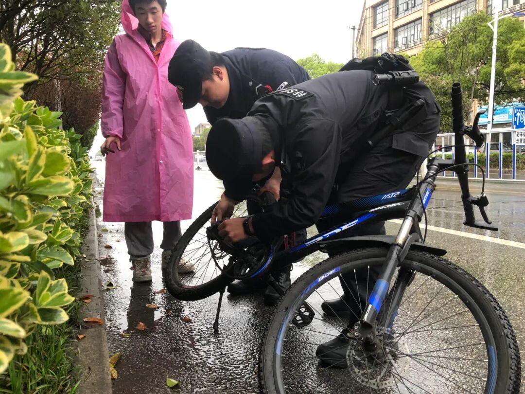 “那个行人自行车链条好像掉了”,上午,11:20,队员巡逻途中发现一名群众在路边摆弄着自行车链条。“愣着干什么,快下去帮忙!”,连绵的阴雨不仅焦虑了群众的心情,也让链条裹满泥沙“面目全非”,顾不上脏,队员们立即上手帮忙。功夫不负有心人,看到特警队员黑漆漆的双手让链条与齿轮重归于好,群众的脸上逐渐泛起笑容,连声感谢特警队员的帮助。