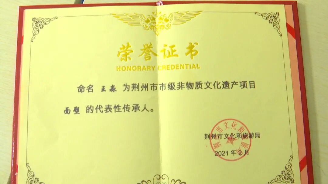 随着江陵的发展日新月异,王淼又有了以面人来展现家乡发展,反映时代风貌的想法。恰逢江陵县发起了以非遗还原江陵故事的项目,邀请王淼以面塑的形式来诉说江陵故事。随后他便创作了《滨江公园》《仙鹤楼》等作品,并于2019年在全国第二届“金手指奖”泥面塑大赛上荣获最佳创意奖与最佳传承奖等荣誉。他的“江陵面塑”项目也先后被列入江陵县、荆州市非物质文化遗产名录。