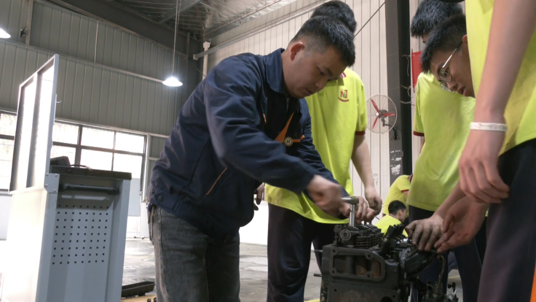 走进江陵县职教中心机械加工实训基地,一阵机器轰鸣声传来。在实训基地内,农业机械使用与维护专业的学生们正在班主任胡宇的指导下,对农机进行维护。胡宇告诉小新,现在学生们训练的科目是机械加工实训和农机维修竞赛队训练,正在为即将到来的荆州职业学校技能竞赛备赛。