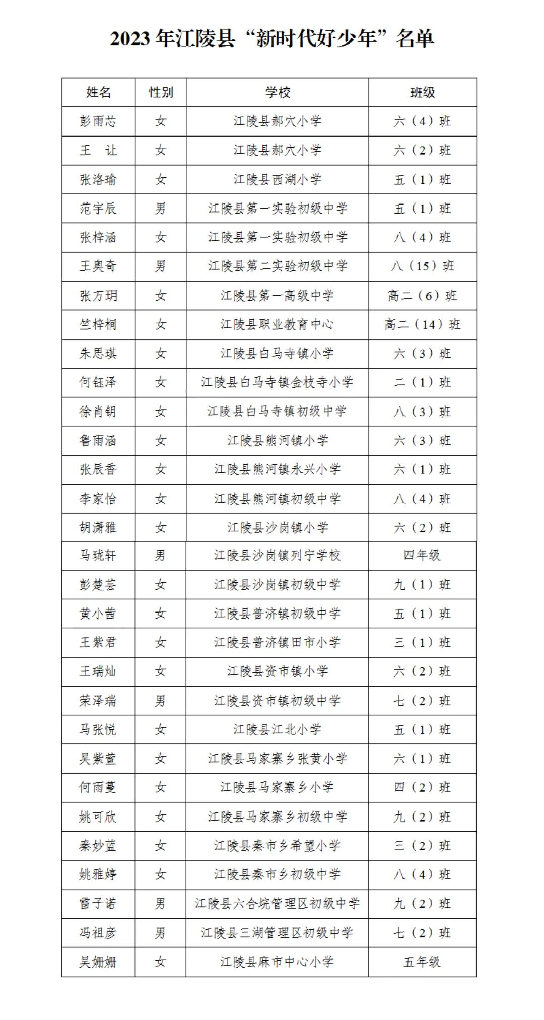 为深入贯彻落实“培养担当民族复兴大任的时代新人”要求,进一步培育和践行社会主义核心价值观,引导未成年人“扣好人生第一粒扣子”,县委文明办、县教育局组织开展“新时代好少年”评选活动,通过挖掘青少年学生身边的先进典型,让全县未成年人学有榜样、行有楷模、赶有目标。经过逐级推荐、认真筛选、审核评议等环节,来自全县各乡镇管理区有突出表现的30名优秀中小学生,被评为 2023 年江陵县“新时代好少年”。