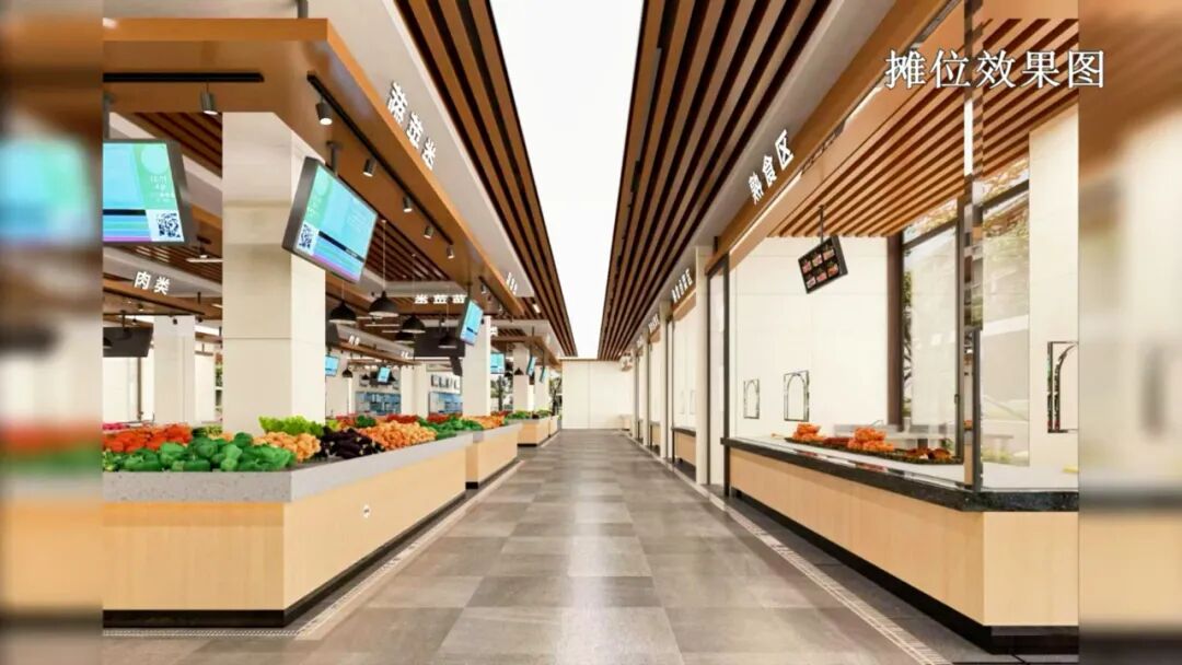 马春说,一楼市场占地1200平方米,完全覆盖老百姓日常消费的9大类菜系,功能划分清晰完整。为周边的商户配套有自产自销区,满足周边商户自产自销菜品的整体使用。综合楼共分为三层,二楼是8.8米高的宴会厅,可以满足周边百姓的婚礼、生日等喜事需求,三楼是3.9米高的办公区域,能够提供写字办公等商务需求。