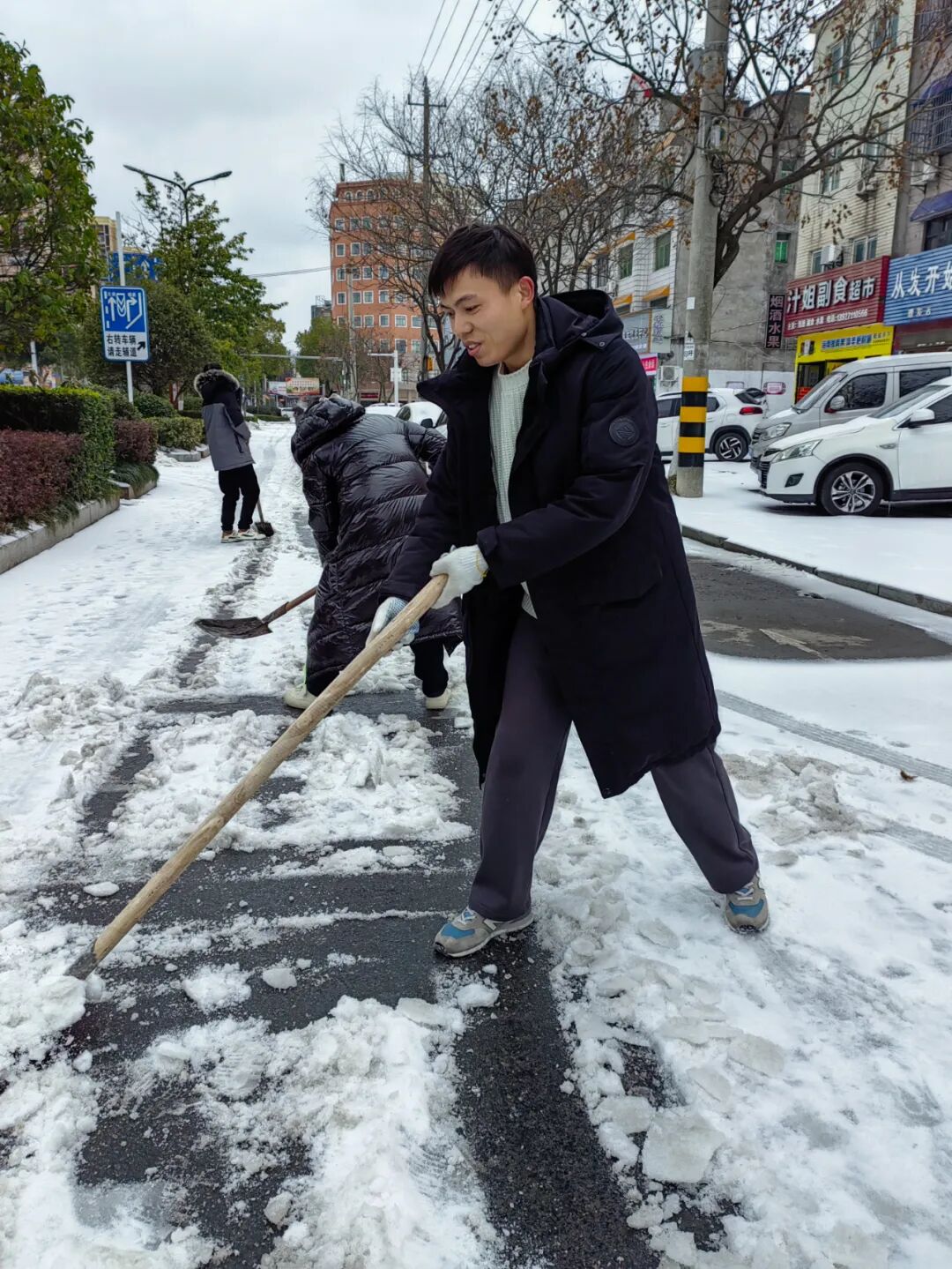 2月22日,普济镇群众、志愿者们拿着自家的铁锹、扫把,响应号召,自发地开展铲冰除雪行动。