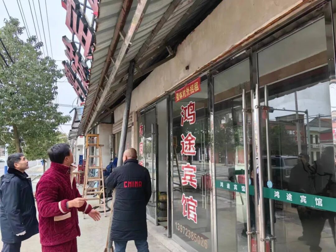 同时乡城建办走访商铺,农贸市场、铺设草垫对危险的建筑拉上警戒线进行封锁。
