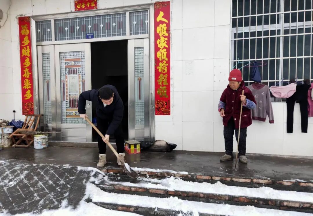 秦市乡秦家场村驻村工作队为独居老人清扫门前积雪。