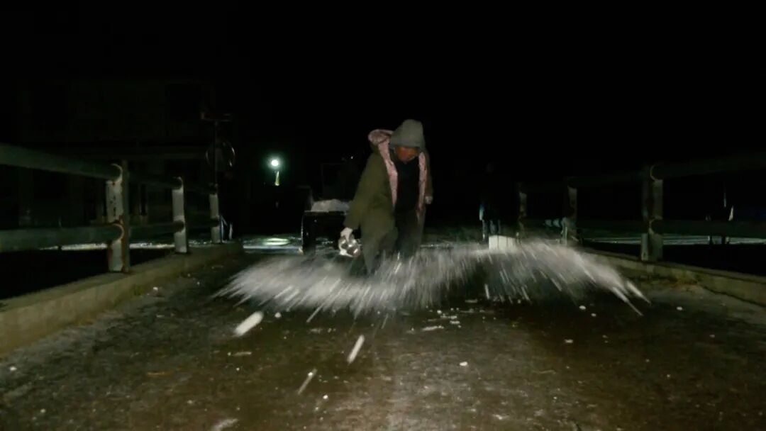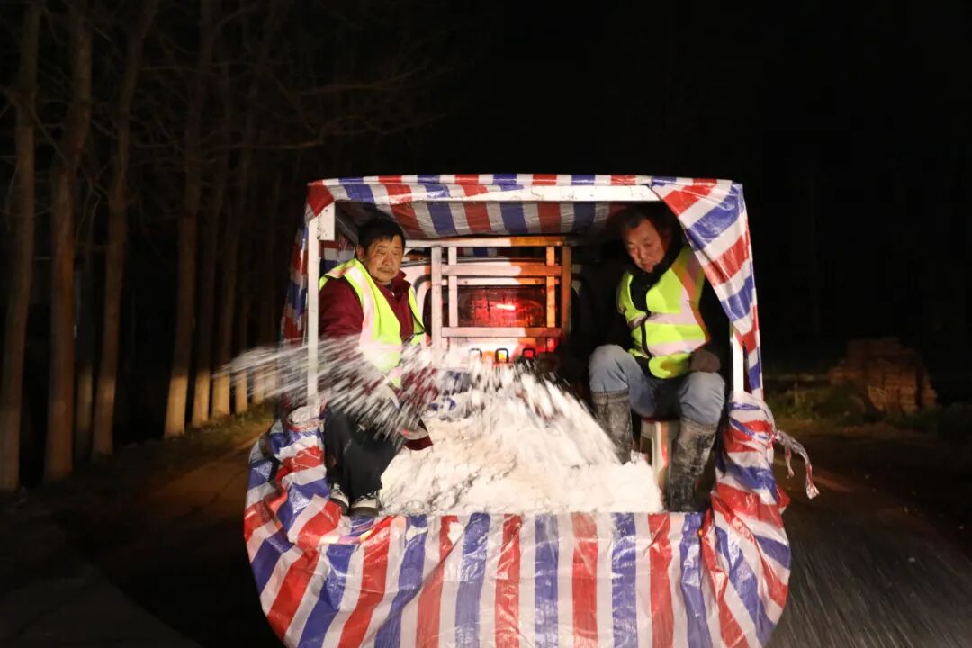 当晚七点,在马家寨乡滩林路,杨渊村村民汤乐海和工作人员正在进行今天第三轮的撒盐除冰工作。随着夜间气温的骤降,刺骨的寒风掺杂着冰粒,打在人脸上生疼。汤乐海身着厚重的防寒服将盐粒均匀地抛撒在路面,虽然寒风凛冽,但他手上的动作却一刻没停。