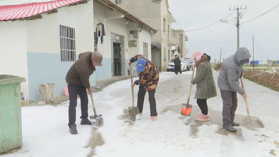 郝穴镇颜闸村二组的村道是附近村民们前往村委会的主要道路,冒着寒风,村民们将自家门前清扫干净后来到村道上,弯腰挥起铁锹,自发铲冰除雪,几人三两下就将路面上的冰雪清理完毕,他们的行动变成了最好的“融雪剂”。
