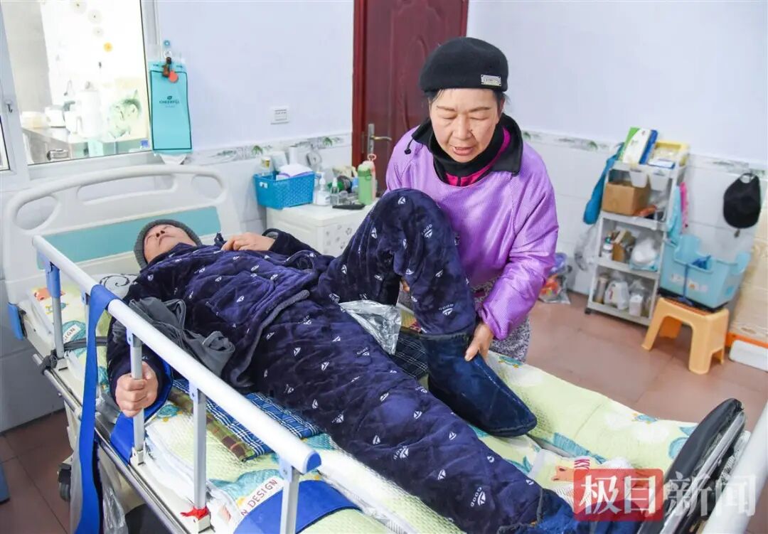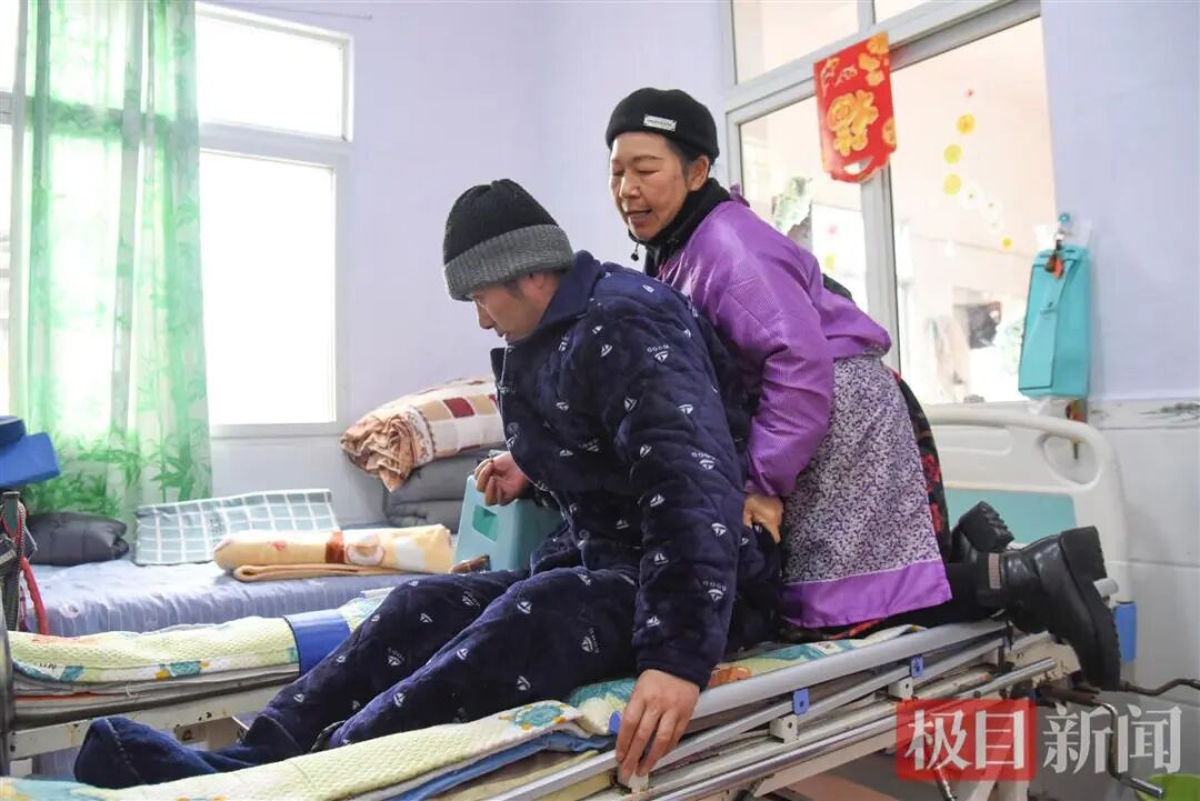 陈春娥在使劲挪动丈夫朱荆州,防止肌肉出现萎缩