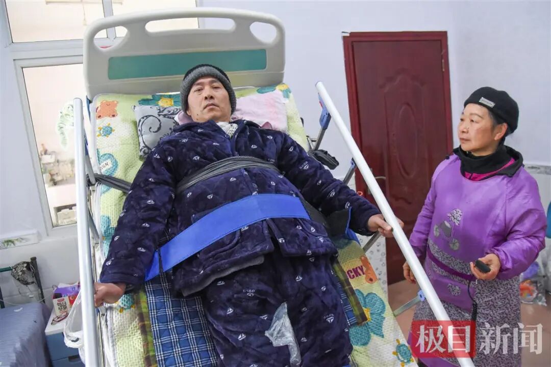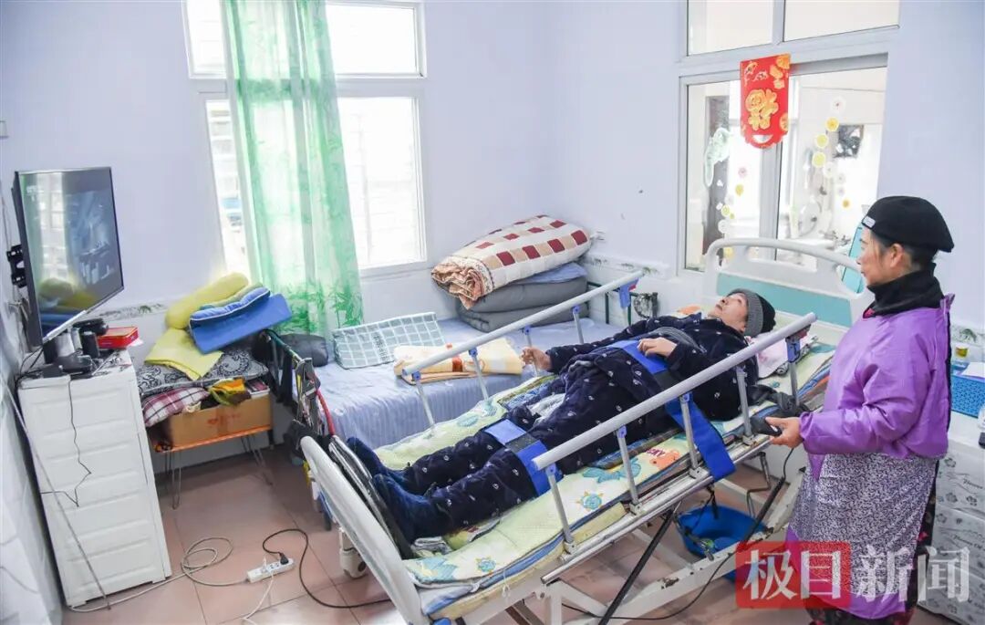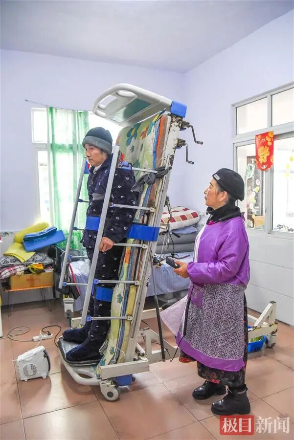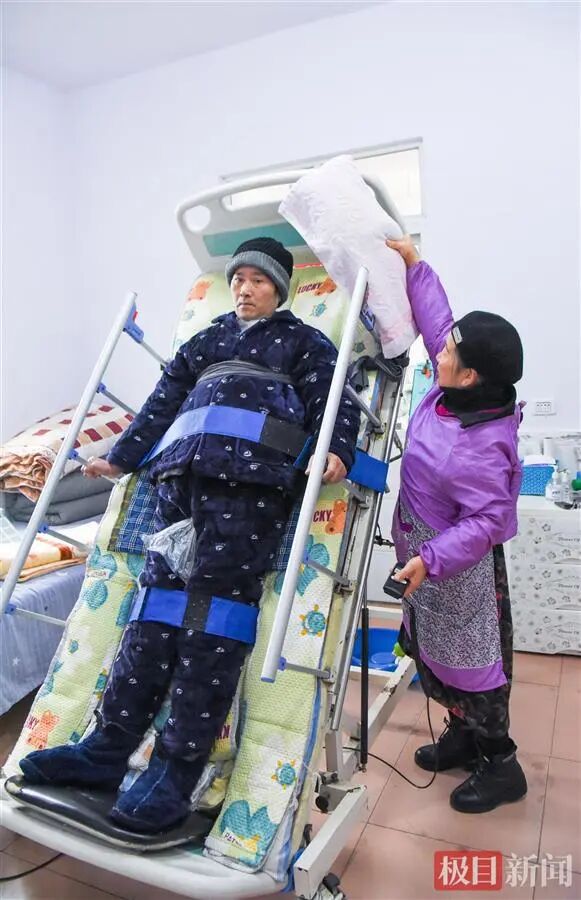 一张护板有些生锈的护理床,被陈春娥慢慢调整成垂直于地面的角度。借助腹部和胸部的束缚带,朱荆州的身体紧紧贴在床面。