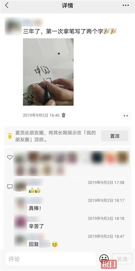 “三年了,第一次拿笔写了两个字!”这是2019年9月2日,陈春娥激动地在朋友圈分享的一句话。当天,正在引导丈夫进行四肢训练的陈春娥,尝试让他在纸上写字。