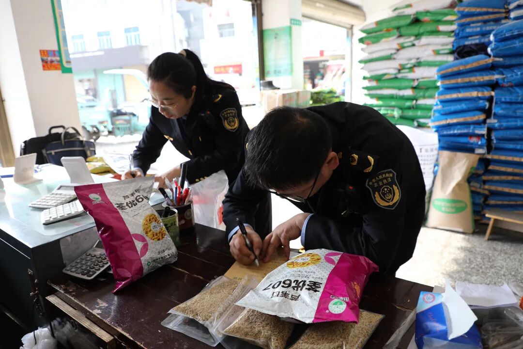 在乡镇农资经营销售点,县农业综合执法大队工作人员逐一检查种子、化肥、农药等关键农资产品的合格证明、标识,详细核对进销货台账,以杜绝任何掺假、欺诈行为。随后,工作人员还随机选取多个水稻品种进行了质量检测。