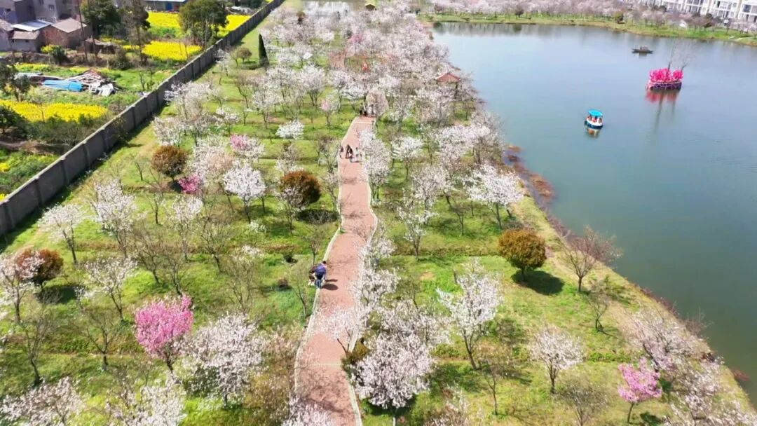 春回大地,万物复苏。在六合垸樱花谷,连片盛放的樱花吸引了不少游客驻足打卡。为提升游客体验感,六合垸管理区不断完善步道、路灯、污水管网等基础设施建设,还打造了儿童游乐园、休闲凉亭和爱心廊道。此外,游客来到六合垸管理区还可以乘坐旋翼小飞机,高空俯瞰樱花谷美景,一览水乡平原风光。