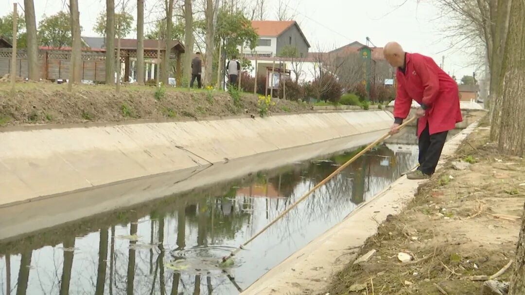 在马家寨乡赵桥村,村民正在对辖区沟渠周边的垃圾、水面漂浮物进行清扫打捞。
