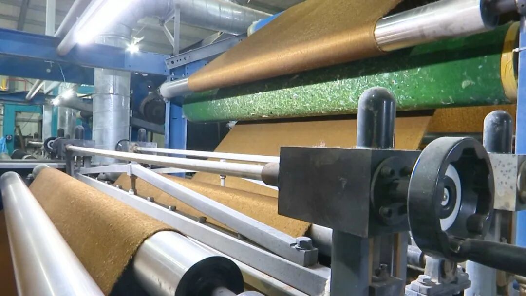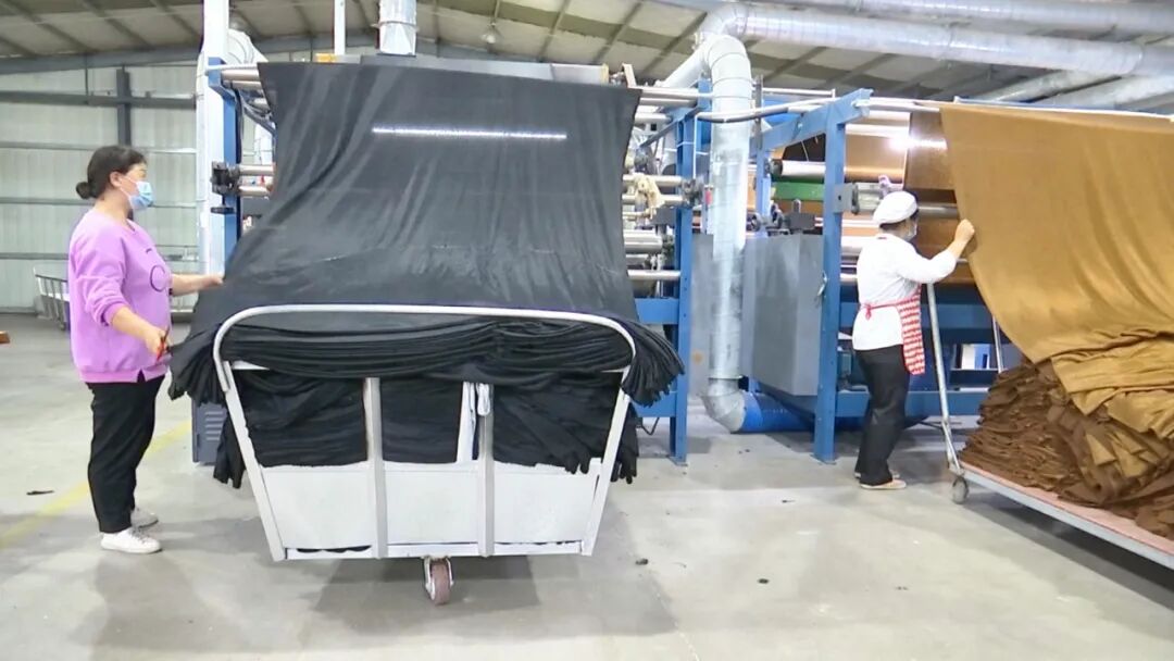 走进昊阳纺织的生产车间,在15条生产线上,百余台设备正高速运转着。摇粒机、整经机、织布机,主辅设备相互配合,一根根白线编织为布、一缕缕纤布幻化为皮。
