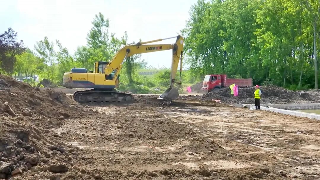 在周孔桥-南环路-永济南桥片区施工现场,来来往往的渣土车正在往工地运输土方。一旁,轰隆作响的挖掘机正在平整地面。观景平台上,施工人员在对平台钢架进行固定,以方便后期水泥浇筑。