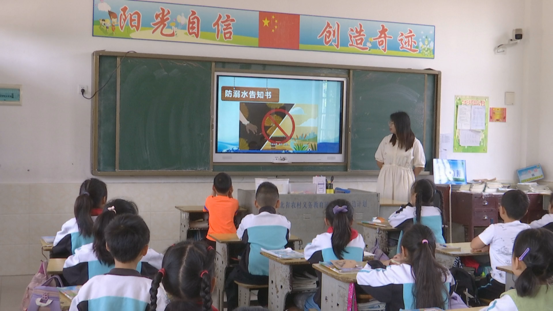在六合垸管理区初级中学,教室里正在播放防溺水宣传动画。教师带领学生用合唱的形式学习防溺水的相关知识。