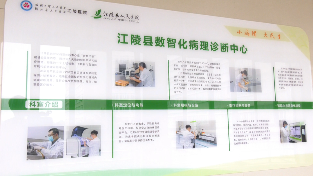 江陵县数智化病理诊断中心是基于传统病理诊断的整体数智化升级,与省市平台进行了全面的互联互通,为患者提供了包含组织、细胞、分子等相关病理数智化检查服务,特别是在为患者的肿瘤确诊中将更加发挥出“金标准”的作用。
