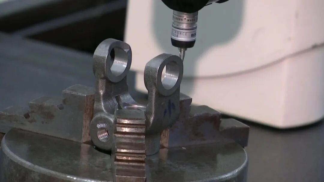 王德奇介绍,企业通过自主研发车铣复合机,能将制作汽车转向节叉的铣外宽、花键底孔、螺纹等11道加工工序精简为1道。质量上能够保证,且时间缩短,将11道装夹的累计误差变成1次误差,稳定性比以前更好。