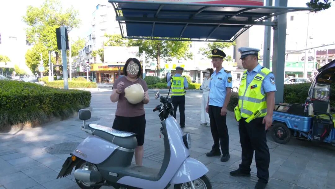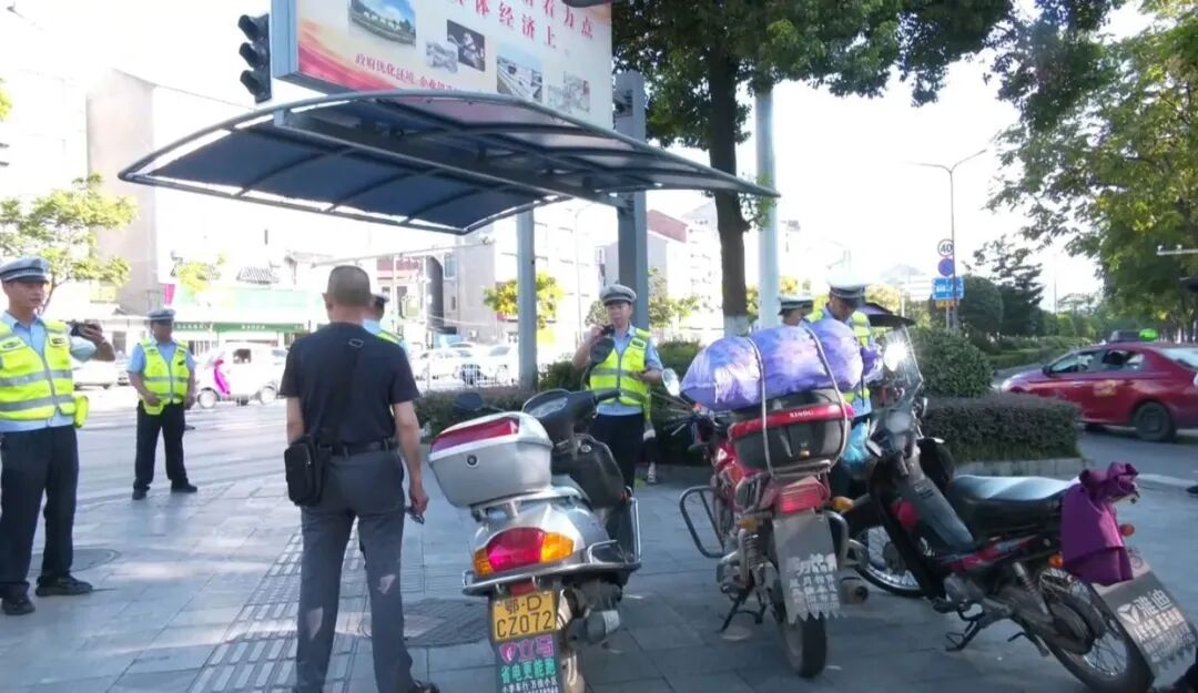 在中心路和仙鹤路交叉路口,交警正在对无牌无证、未佩戴安全头盔和违规加装遮阳伞(棚)等交通违法行为进行查处,并要求交通违法者穿上黄马甲一同宣传交通安全知识,为交通安全宣传“以身说法”。