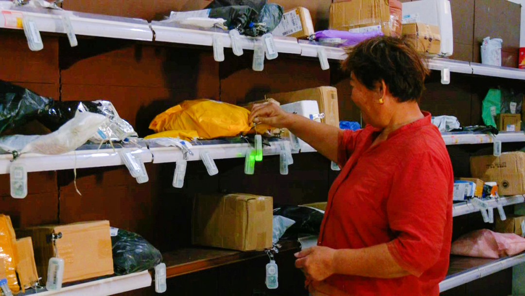 在熊河镇荆干村快递服务点,货架上的每一个快递都被安装上了一个类似u盘的神秘装置。住在附近的王阿姨前来取快递时,这个装置便会同时间亮灯并发出滴滴声。据服务点负责人彭钦华介绍,该装置为网点引进的“智慧灯条”。